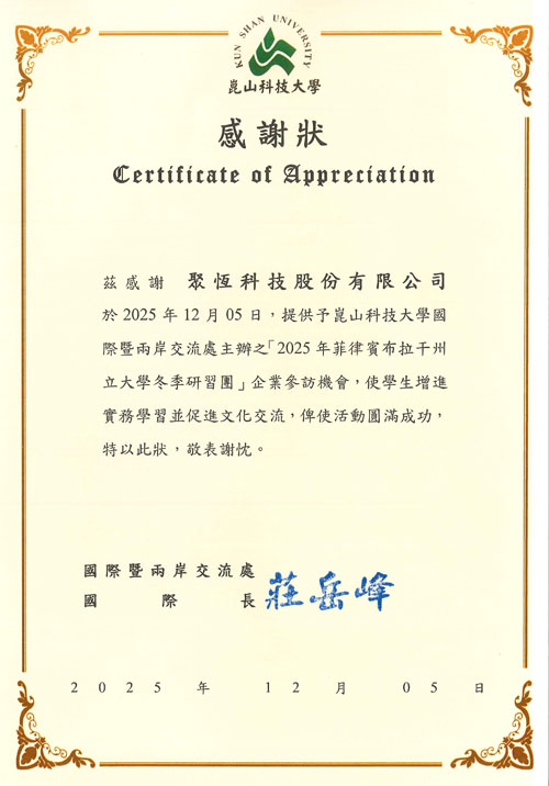 2025崑山大學 x 菲律賓布拉干州立大學冬季研習團感謝狀(114年)